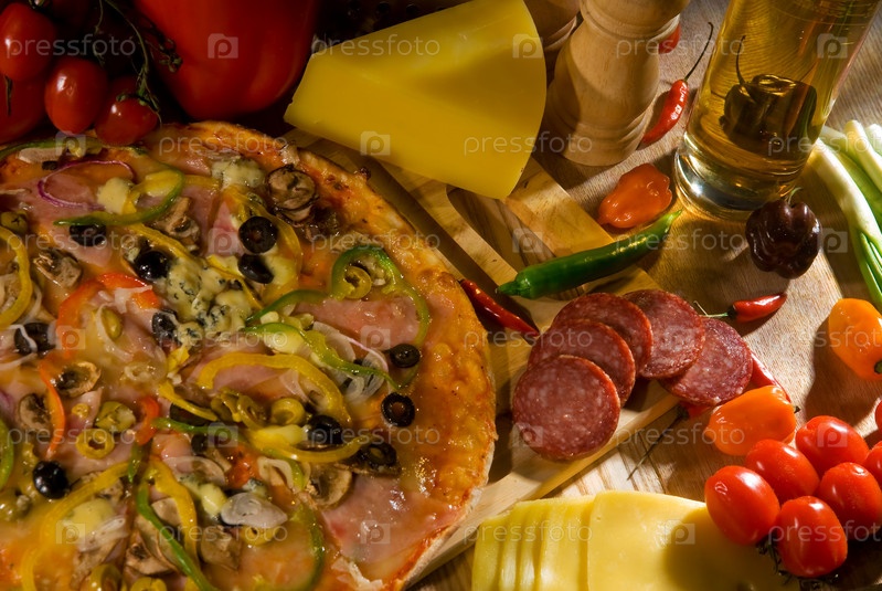 Пицца, колбаса, сыр и овощи на столе