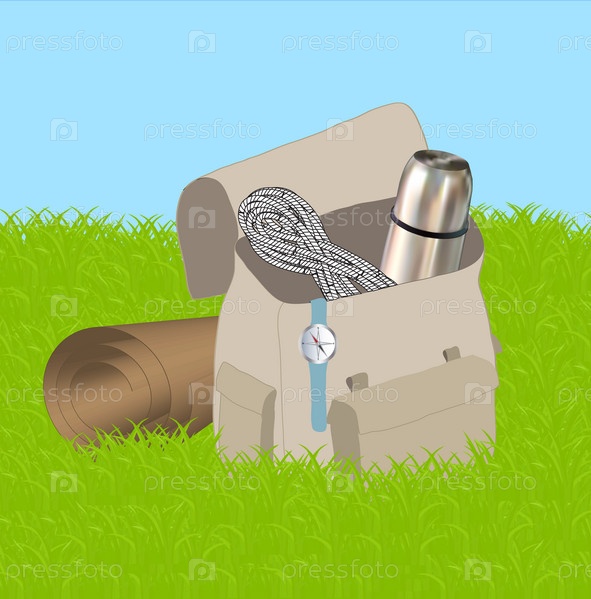 Рюкзак с термосом и другие туристические принадлежности на траве