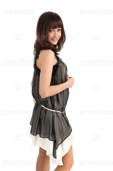 Привлекательная брюнетка в платье на белом фоне