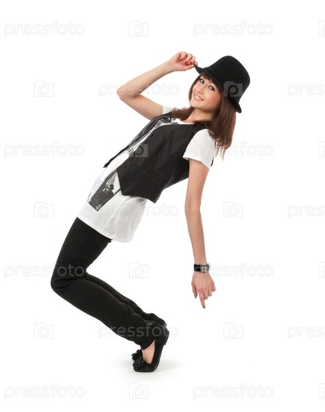 Привлекательная брюнетка в шляпе танцует на белом фоне