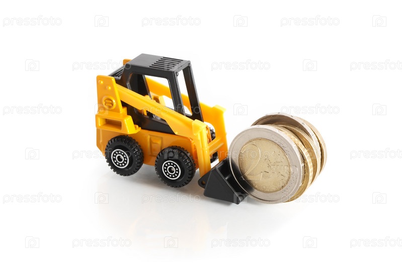 Бизнес-концепция. Игрушечный автопогрузчик с евро на белом фоне