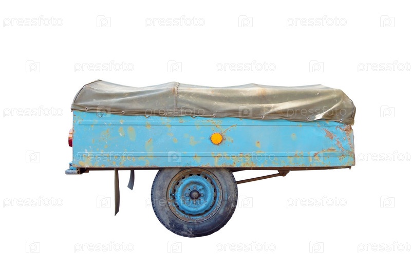 Старый автомобильный прицеп на белом фоне
