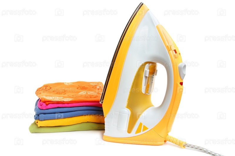 Железо и куча одежды на белом фоне