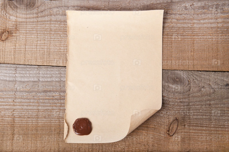 Старый лист бумаги с сургучной печатью на фоне древесины