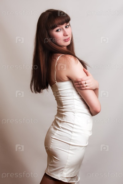 Девушка в белом платье на сером фоне