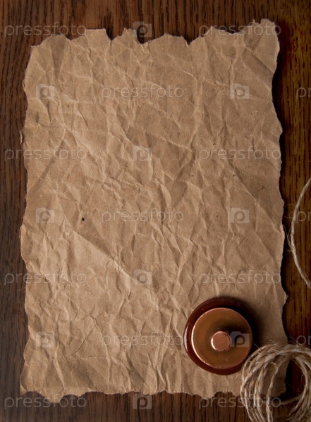 Старая бумага с сургучной печатью и упаковочной веревкой на деревянном столе