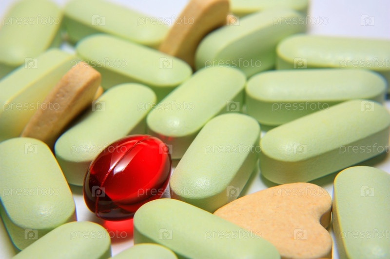 Красная капсула среди зеленых и желтых таблеток