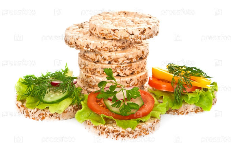 Зерновые хлебцы с овощами на белом фоне