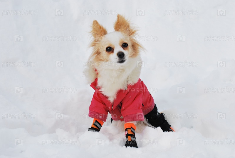 Длинношерстная чихуахуа сидит на снегу в красном комбинезоне