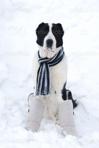 Среднеазиатская овчарка сидит на снегу в шарфе и валенках