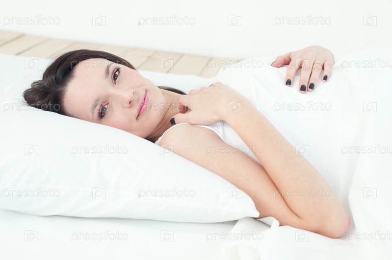 Очаровательная молодая женщина лежит на подушке и смотрит в камеру