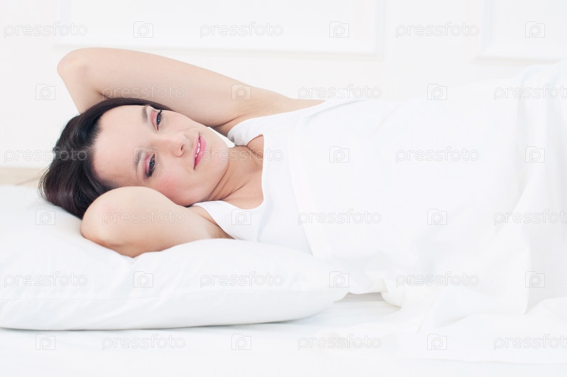 Молодая женщина мечтает, лежа в постели