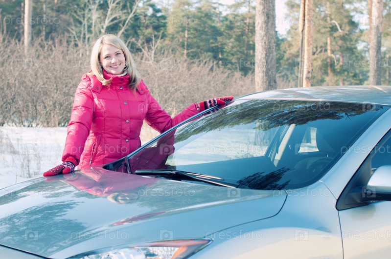 Молодая женщина, стоящая возле автомобиля в зимнем лесу