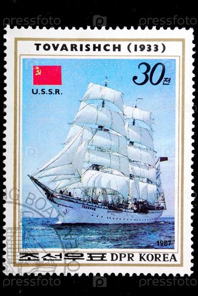 Почтовая марка КНДР 1987 года с изображением парусного корабля
