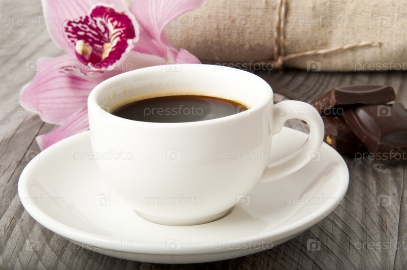 Чашка кофе с шоколадом и цветком орхидеи на деревянном фоне