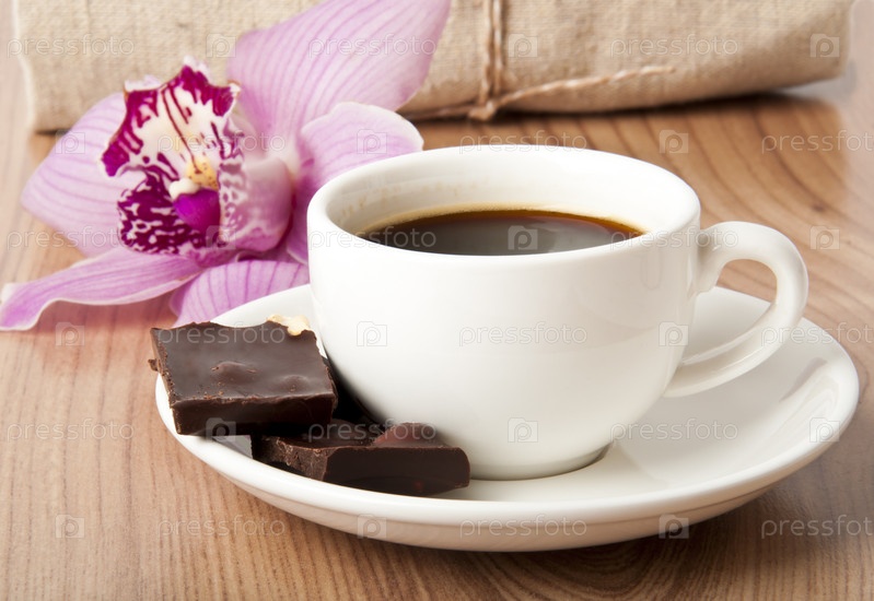 Чашка кофе с шоколадом и цветком орхидеи на деревянном фоне