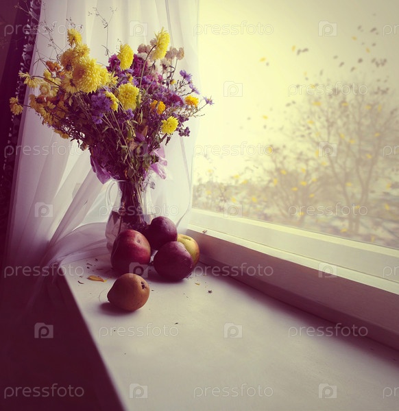 Цветы и яблоки на окне