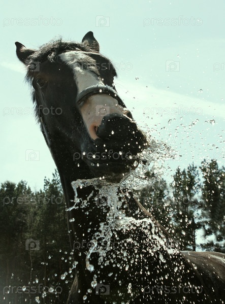 Водная струя разбивается о морду лошади