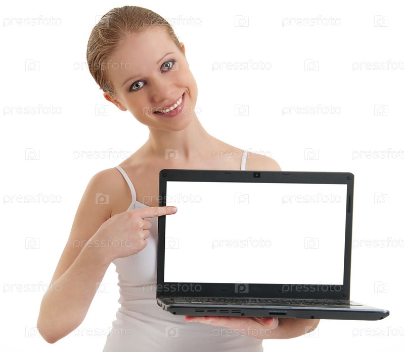 Портрет молодой женщины с ноутбуком на белом фоне