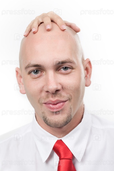Портрет улыбающегося мужчины с женской рукой на его лысой голове