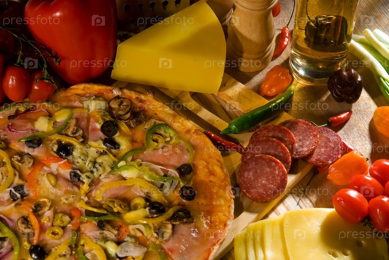 Пицца, колбаса, сыр и овощи на столе