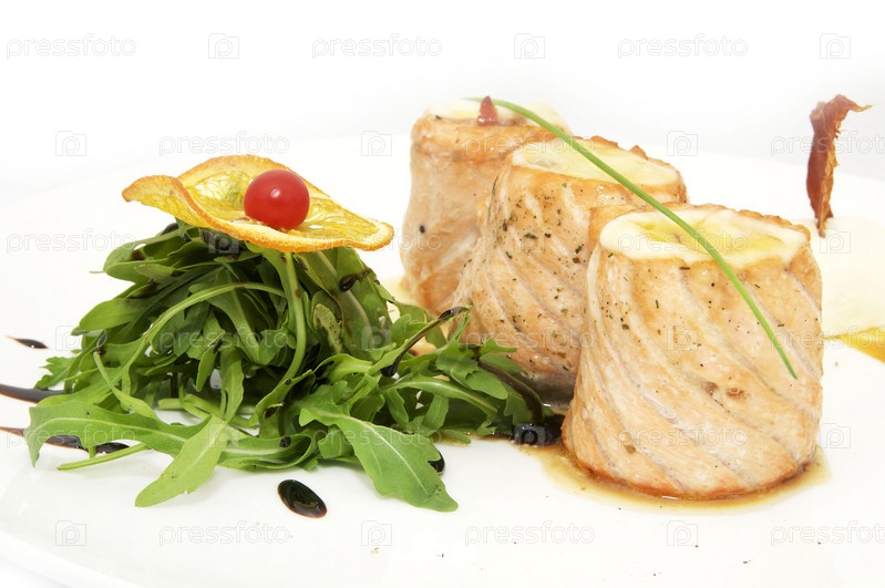 Рулетики из рыбы с зеленью и овощами на белом фоне