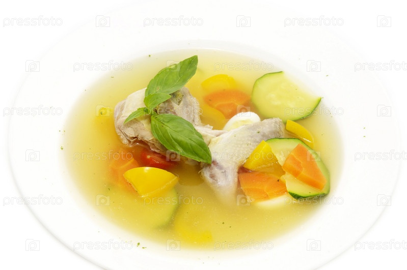 Бульон с перепелом, овощами и зеленью на белом фоне