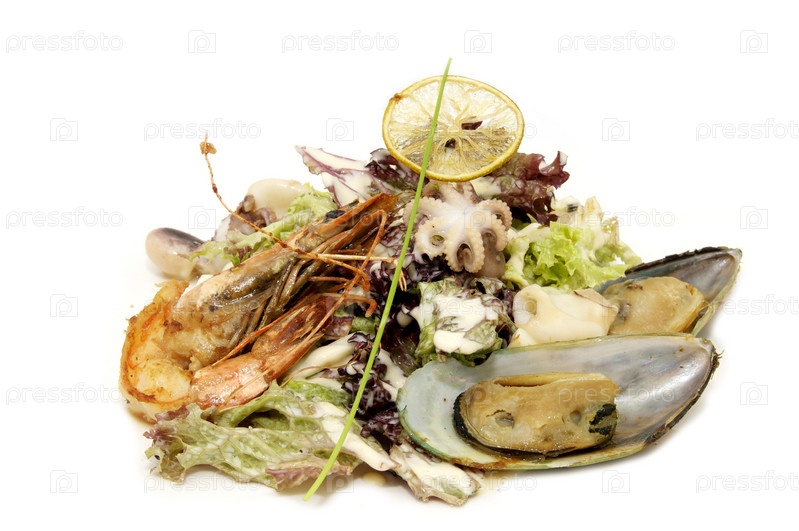Салат из креветок и мидий на белом фоне