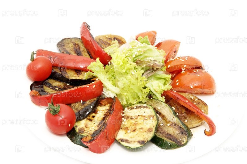 Овощи на гриле и зелень на белом фоне