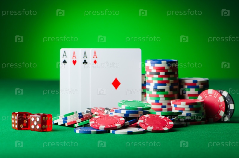 Игральные фишки, карты и кости на зеленом сукне