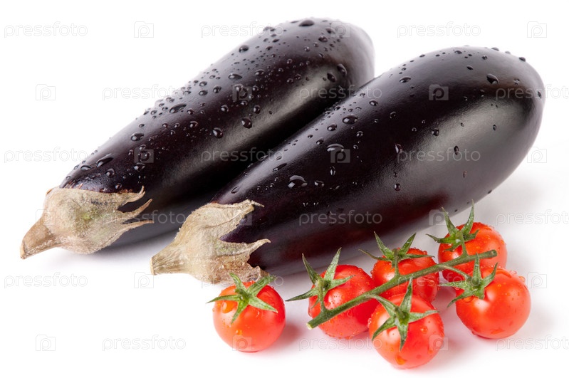 Два баклажана и помидоры черри на белом фоне