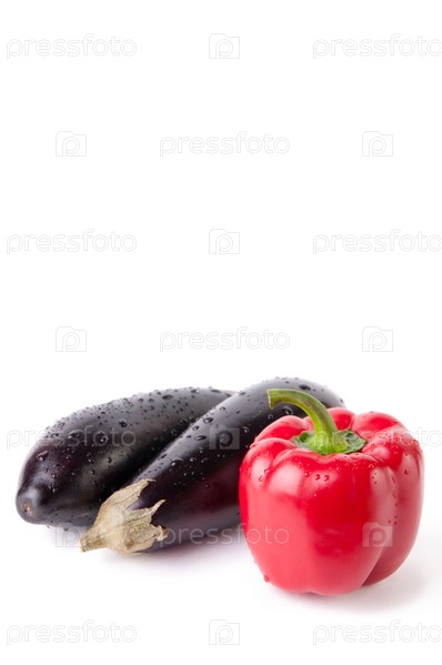 Мокрые баклажаны и красный сладкий перец на белом фоне