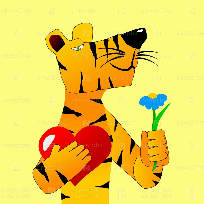 Мультипликационный смешной тигр с сердечным поздравлением