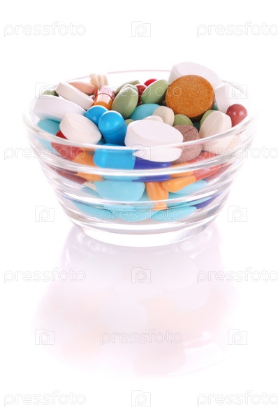 Разноцветные таблетки в стеклянной миске