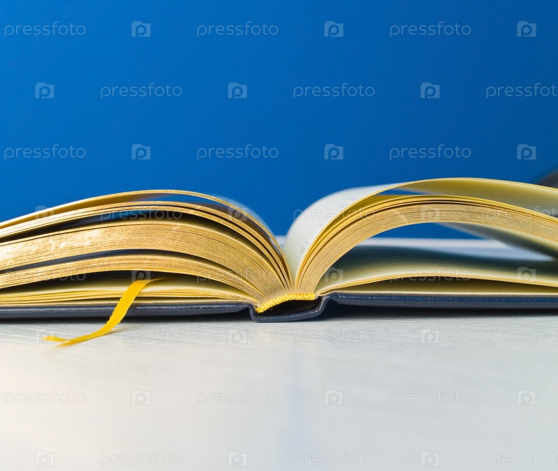 Ежедневник бизнесмена с золотой закладкой лежит на белом столе