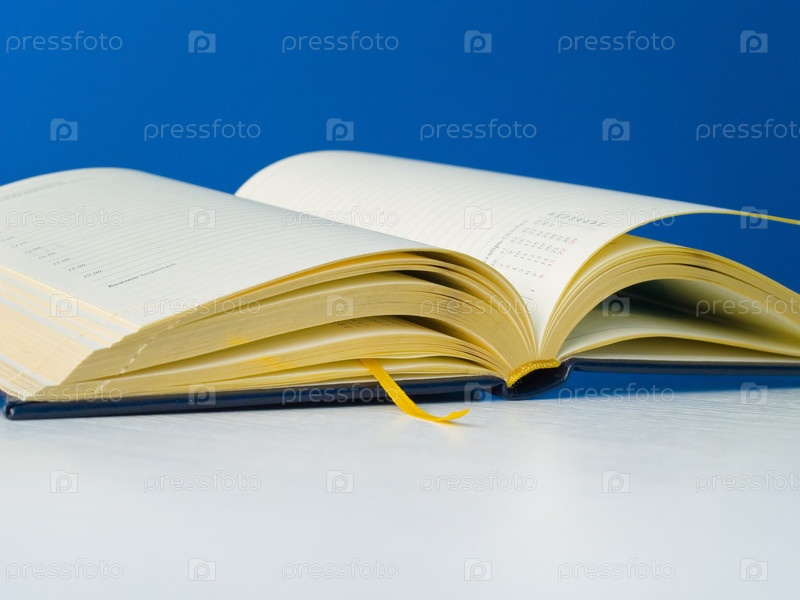 Ежедневник бизнесмена с золотой закладкой лежит на белом столе