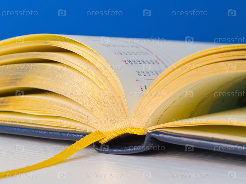 Ежедневник бизнесмена с золотой закладкой лежит на белом столе