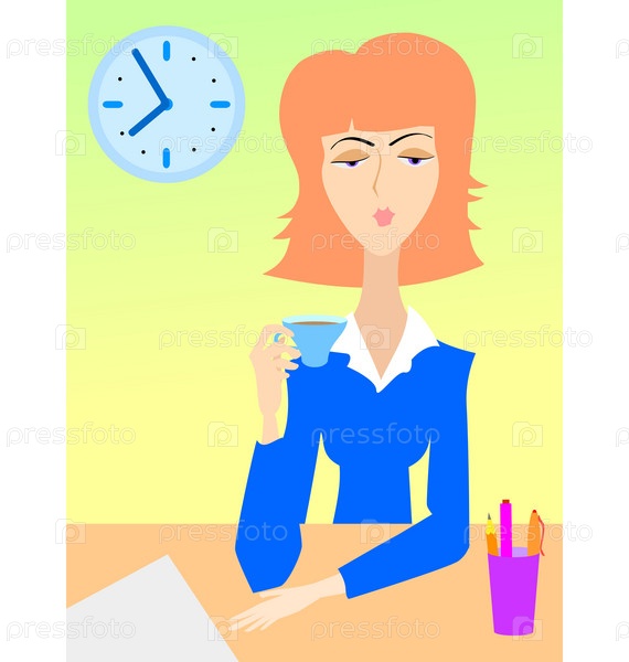 Женщина в костюме пьет кофе в офисе