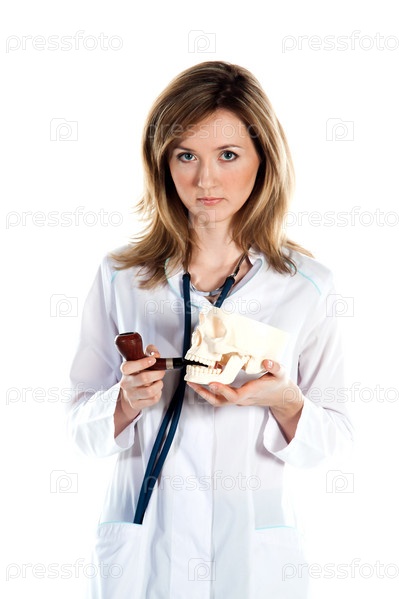 Портрет молодой и красивой женщины-врача на белом фоне