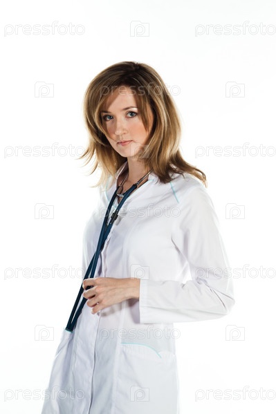 Портрет молодой и красивой женщины-врача на белом фоне