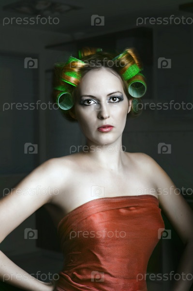 Молодая привлекательная женщина-домохозяйка с бигуди