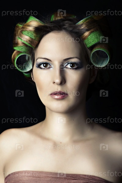 Молодая привлекательная женщина-домохозяйка с бигуди