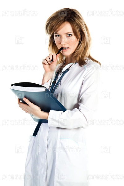 Портрет молодой и красивой женщины-врача со светлыми волосами в белом медицинском халате