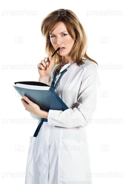 Портрет молодой и красивой женщины-врача на белом фоне