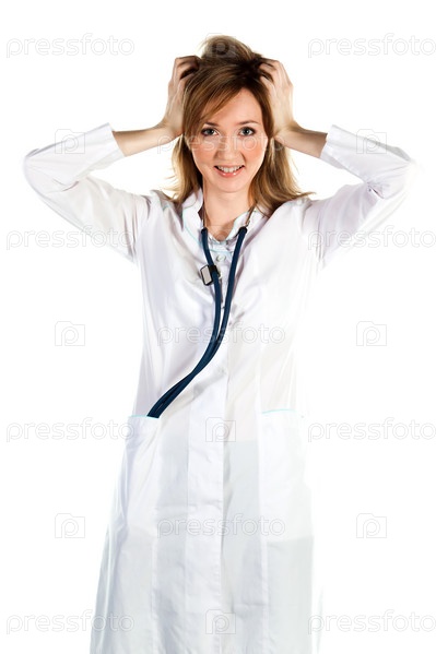 Портрет молодой и красивой женщины-врача на белом фоне