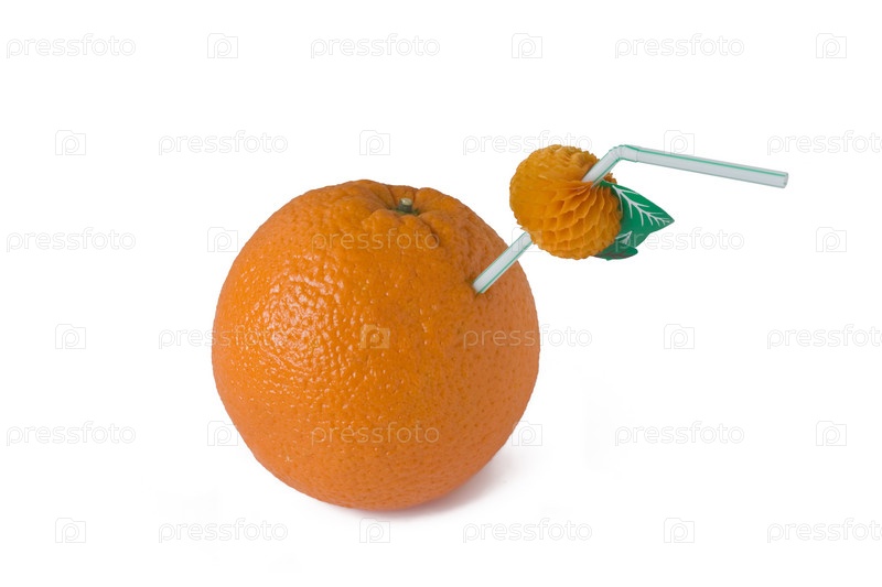 Большой спелый апельсин с трубкой для коктейля на белом фоне