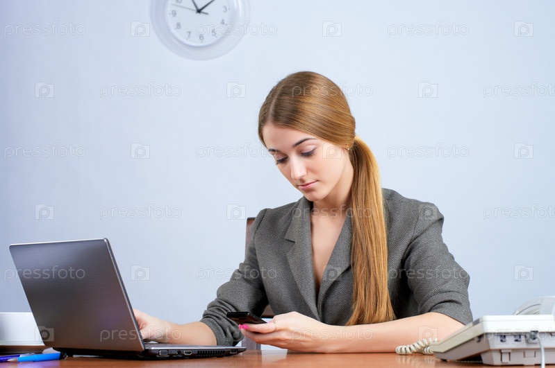 Деловая женщина за рабочим столом с мобильным телефоном в руке