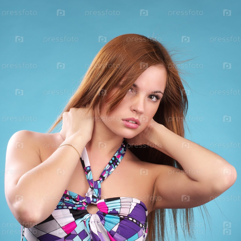Красивая женщина в летнем платье на синем фоне