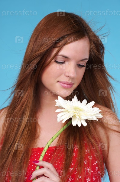 Портрет женщины с белым цветком на синем фоне