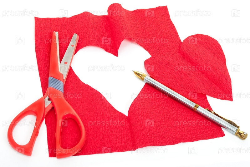 Вырезанное красное сердце из бумаги с ножницами и ручкой на белом фоне